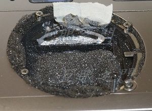 但是上方在銑穿過去的一瞬間一定會有碎屑,穿透後,縫隙再塞些海綿,不過有點難,因為海綿會被銑刀捲走,只好把相機開口朝下,用手工銑刀由下往上銑,這樣碎屑大部分會掉到地上,但還是有碎屑進到頂蓋中,雖然最後用吸塵器吸過,但還是有些殘餘,沒辦法了,頂蓋不敢用暴力,如果有廢機身拿來練習,應該可以拆的開。