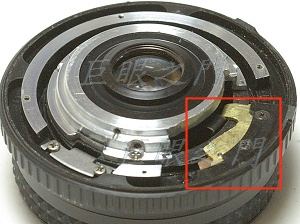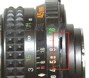 鏡主要用在 MD/SR 的機身上,因為尾巴切短了,所以光圈環應該會頂到機身上的凸桿,所以會頂到凸桿的區域要磨掉,但是如紅框中,磨掉後其實會有些縫隙,外面的雜物也許會進入鏡身。