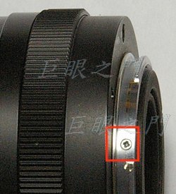 裝好接環之後就在鏡身上適當的位置磨一個小凹槽,作為鏡頭卡榫的定位孔,圖中是在正上方的位置。