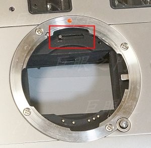 這個桿子是鏡頭與機身連動用的,是調整觀景窗的視野範圍,裝的如果是 28 mm 的鏡頭就不需要調整,如果是其他焦距的鏡頭,鏡頭上會有桿子將小凸起向右方撥動,觀景窗視野會連動變小。