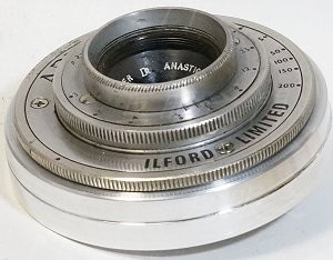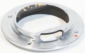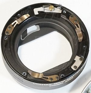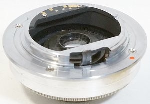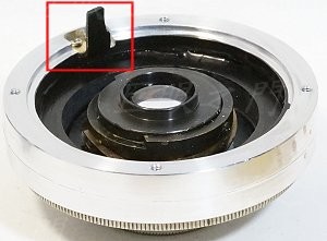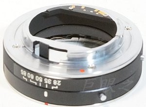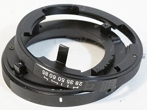 後面有晶片,應該是可以使機身自動曝光用的。圖中左方可以看到轉接不同焦距鏡頭的設定,這個機構主要是調整轉接環上的桿子的位置,以便與機身連動調整觀景窗視野。