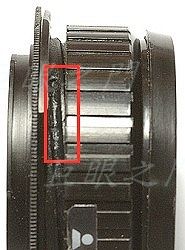 於是像紅框中那樣,把原來的複螺紋繼續往接環方向磨,磨到鏡頭可以頂到接環才行。磨這個東西非常麻煩,因為不能磨太鬆,也不能磨得不夠,只能慢慢用手工磨時間。改這個鏡大概有 3/4 的時間是在解決這個法蘭距的問題。