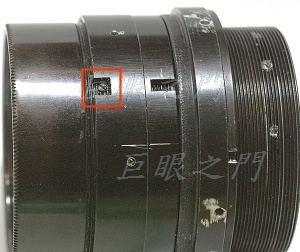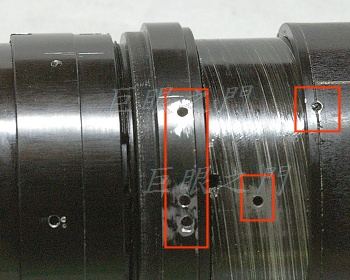 這些洞不是鏡主弄的,買來就這樣。左方紅框中是鎖光圈環的,研判以前的鏡主可能要裝在某些機身上,而法蘭距可能不太對,所以又調整之類的。