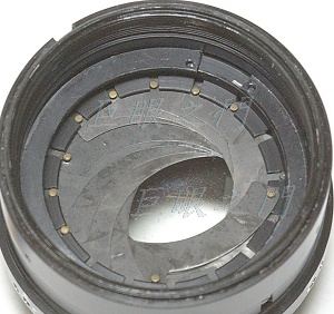 錯位的光圈葉片。上面有個卡環,要拆掉才能把葉片取出。