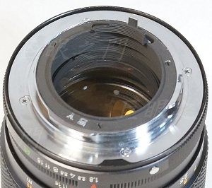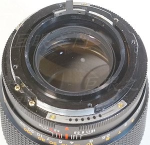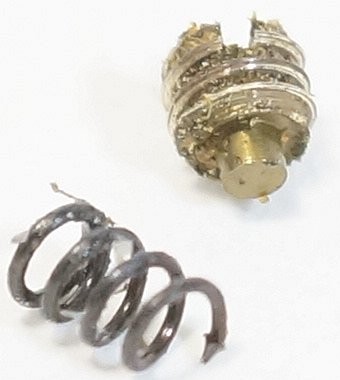 這個彈簧也應該要上些油,但是不能由外面上,因為螺絲裝上時要點些螺絲膠,上了油怕黏不住。所以要把光圈環拆掉,原來光圈環上兩個銅的零件都要拆掉才能把光圈環轉出來。左圖是光圈環拆下後的外觀,這裡面根本沒有油啊。上點油,把零件都裝回,調到適當鬆緊度,點螺絲膠,再把接環裝上就完成。
