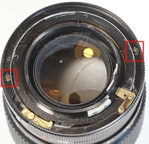 這裡有兩個小螺絲,裡面壓著光圈定位鋼珠以及彈簧,本來以為轉鬆就好,結果覺得即使轉鬆也還是緊,而且調太鬆也不行,因為螺絲太凸出可能頂住接環。