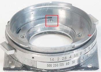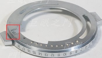 紅框中原來有些卡齒,磨平或是弄彎皆可,反正不要突出即可。旁邊磨了一些小凹孔,要做為光圈定位用;此鏡一定要有光圈定位,因為光圈機構彈力還滿大的,沒有定位鋼珠,光圈會自動彈到最小光圈處。