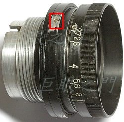 左方的紅框中那隻大螺絲是聯繫光圈寰與內部光圈機構用的,螺絲拆下後就可將光圈環一直轉下來。