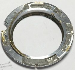 將兩部份貼合後,用 AB 膠黏死,這是接環內側的外觀。黏的角度要注意,外環上面本來有個弧形的缺口,原來是避過機身上自動對焦轉軸的,但是現在兩個環要合而為一的話,要使那個缺口不要對著機身的對焦馬達轉軸,否則退鏡頭時會卡到轉軸,而且還要評估在哪個角度與廢鏡原來的螺絲孔能配合。
