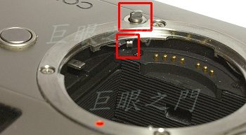 畫面左方的圓形鈕是退鏡鈕,對應的下方則是鏡頭卡榫。