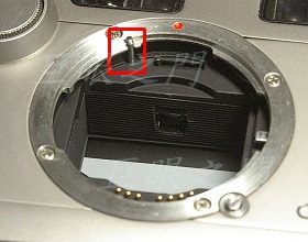 這裡還有機關,機身裡面有個橫著移動的桿子,這是鏡頭焦長與機身觀景窗範圍連動的桿子,不同焦長的鏡頭裝上後,將桿子推開的角度不同,觀景窗的範圍會隨著連動,桿子壓到最右邊應該是配合 90mm。
