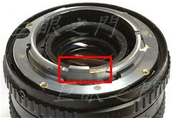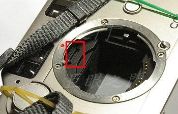 機身上要避過的東西還不少,上面紅框中的是對焦馬達轉軸。下方的紅框中,是一個小突桿,鏡頭接環裝到定位時,插刀會頂住突桿,通知機身鏡頭裝上了,可是測試時發現如果不是原廠的自動鏡頭裝上機身時,快門無法擊發,所以改鏡的話,要把原來頂住此位置的插刀稍微磨掉一點。