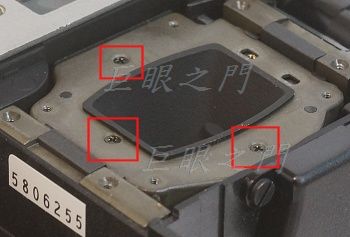 快門葉片以及感光器拿掉,看到三隻螺絲,這三隻螺絲取下,就可以把底下的亂七八糟零件都拆掉,原來以為不需要大拆,所以只有在尾巴外面努力,解果拆的亂七八糟還是拆不掉尾巴,只好由前面拆開。