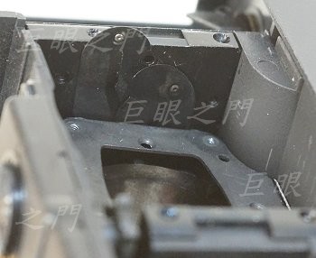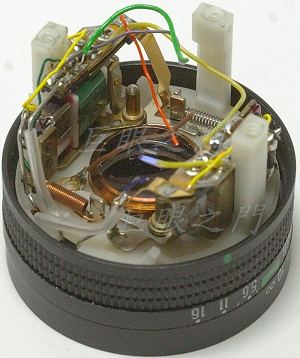 下面的部份,左上方的凸起就是限制前鏡組轉動範圍用的,此鏡是前組對焦。這隻凸桿其實很容易斷掉,很細,測試時不小心就會斷。