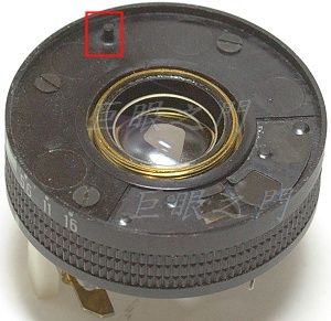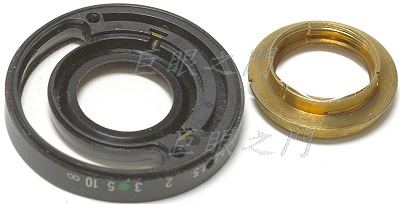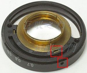 因為光圈數值環不能亂轉,所以要磨個缺口,配合底座環上鎖個螺絲來固定角度,也許您要問為何不從側面打螺絲固定,無法,因為塑膠太薄,而且鎖螺絲會有應力,會稍微變形,而這個環一部份會卡在光圈環內側,變形怕會頂到光圈環造成摩擦力過大。