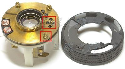 下方紅框中是固定黑色塑膠環的止付螺絲,因為塑膠零件沒什麼受力的能力,所以在上方紅框中增加了一個銅片,螺絲螺紋實際上是鎖在銅片上。這個止付螺絲有兩個,在不同的位置,圖中只看到一個。