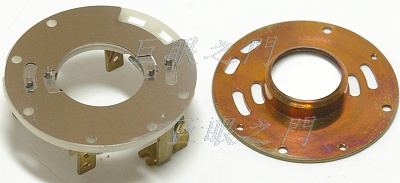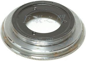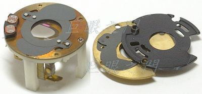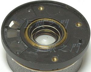 把三隻柱狀螺絲拆下,底下這層也可以取下,右方原來上方的零件翻過來的外觀,裡面有光圈組件,此鏡光圈組件只有兩片。