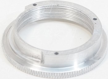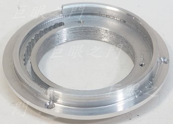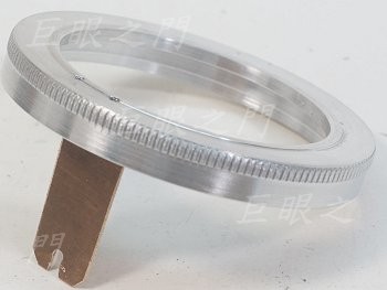 做個鋁環,裡面的螺紋要配合鏡身前方的螺紋。旁邊的縫隙是要容納光圈連動機構的銅片。