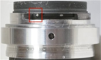 套環由圖中下方的方向已經裝上核心。紅框中是光圈組的連桿,本來光圈組應該要再上面一些,但是要配合連桿位置,只能下移一些。核心這一區要開槽,要安裝光圈連動裝置。