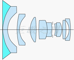 鏡片結構是七群九片,但是要注意,此鏡本來的設計只能在水中使用,在水中使用時要想像前面其實還有一片海水作成的凹透鏡,折射率大約 1.34 左右。在陸地上,前面的凹鏡不見了,被空氣取代,所以會有像差等等的問題。