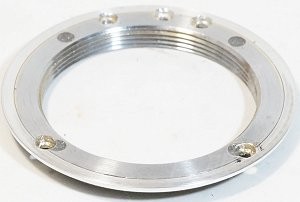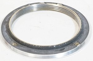 鏡主提供了一個 L39 接環,依照機身接環的螺絲孔鑽了孔,本來配合接環上的孔才會漂亮,但是那要重新鑽孔,天知道會鑽到什麼重要零件,所以還是用現成的孔。這個接環外徑不夠大,所以外緣還黏了一個鋁環增大。