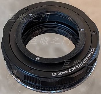 左圖是把一個鎰鋒的 M52-M42,長度 17-31 mm 的對焦筒改造成相反方向;其實就是反過來用,但反過來用就要把原來接機身方向的螺紋接環改成接鏡頭,原來接鏡頭的螺紋改為接機身的接環。圖中原來是接機身端的,現在鎖了一個 M42 的螺紋環,這樣鏡頭尾端的 M42 螺紋就可以裝上去。