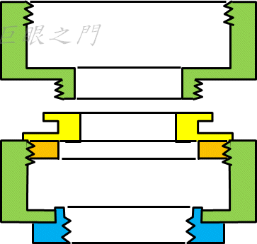 看剖面圖吧,上圖是原來的對焦筒示意圖。下面的圖橘色的部分是先鎖一個螺紋環進去,再把接機身用的接環(黃色)鎖在螺紋環上,這樣接機身端就完成。藍色端是先把原來接機身端的螺紋車掉,擴大孔徑,再把一個 M42 的螺紋環鎖上就可以了。