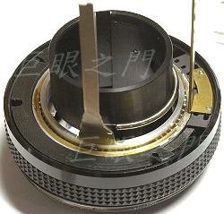 鏡座與裡面的對焦定位器、縮光圈壓桿等,以前已經描述過。此鏡的光圈壓桿原來既定狀態為【開光圈】,因為要改為 M42 接環,所以要改為【縮光圈】。