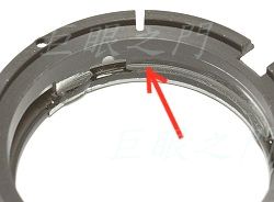 就是這個位置會頂到光圈轉環,因為配合無限遠的關係,即使定位器已經頂到光圈環的機構,但是後面還是會頂到 M42 接環,只差一點點,大約 0.2∼0.3mm 左右,無法解決,因此對焦定位器的邊緣要稍微磨掉薄薄一層,磨到的位置磨掉一些就好,其他位置不用磨。