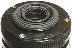 這個鏡原來為何認為改 M42 接環有困難呢,主要是因為這裡有三隻螺絲突出。為了要能對焦到無限遠,在改 K 接環時因為會有點頂到 K 接環的內緣,所以要將接環內部稍微磨一下,磨的程度剛好不會磨穿接環。但是在 42 接環上,因為接環的直徑較小,這三顆螺絲會剛好頂到 42 接環的螺紋處,要磨的話,可能會把接環磨穿,強度問題影響不大,但是會突出於螺紋處,可能會卡到機身上的陰螺紋。
