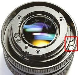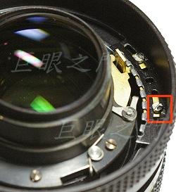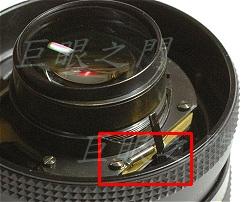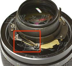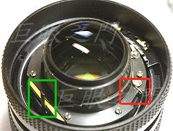 紅框中凹槽是與對焦定位器對應,而綠框中則為縮光圈桿。在對焦定位器旁有個彈簧,可以將定位器頂緊,這倒是第一次看到這種結構。
