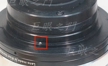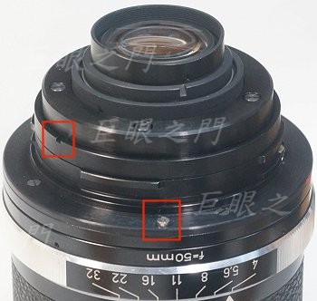 這個系列原來是沒有對焦系統的,下方紅框中是裝鏡頭定位用的,上方紅框中是鎖環的卡槽,這個鏡頭的接環是用這個鎖環鎖上的!
