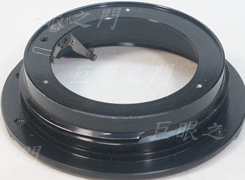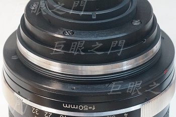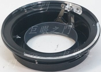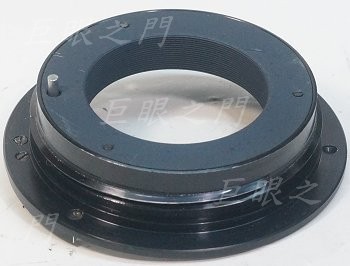 鎖環轉開,可以把接環拆下來。這樣就有機會改了,似乎可以找個 M65 的螺紋環裝在這個位置,後面就可以接上對焦筒了。