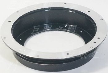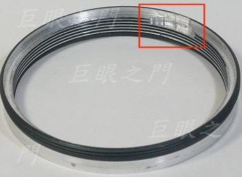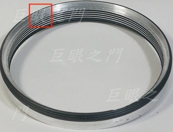 與鏡主討論了機身的規格後,想好了改法就動工。打算做非破壞性改,先找個 M65 螺紋環,把卡在原來鏡身最前方的部分車薄,車到可以套在鏡頭尾巴為準,紅框中的小凹孔是配合定位的突起。