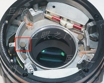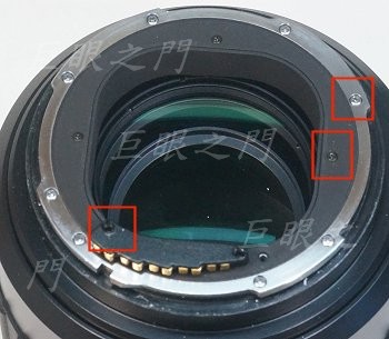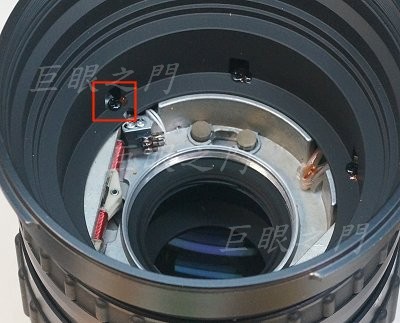 紅框裡面有四個小磁鐵,可以直接取下來。兩邊的磁鐵鏡主說要取下來,要取下就要拆後面的對焦系統,不過,這個鏡的光圈要改手動,後段必須要拆開。