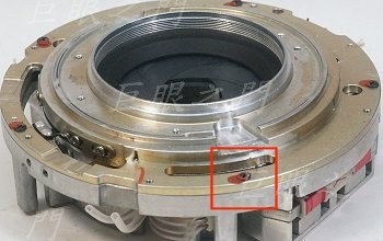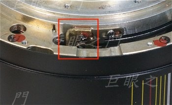 後段的對焦系統可以取下了,紅框中的那個零件要拆掉才能將景深環取下。