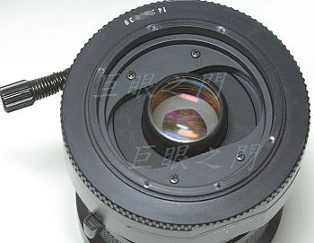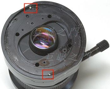 裡面的外觀,有兩顆圓柱狀的小柱子,與尾巴的彈簧配合,是轉動時定位用的,此鏡每 45 度有個定位點,作為定位垂直水平之用。