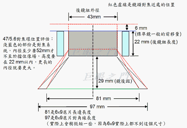 研究了一下,此鏡的大致規格如圖,法蘭距約 29 mm。如果要製作為 6×9 機身,那麼對焦環的尾巴開口至少要有 52 mm,長度要在 22 mm 以內,這很麻煩,一般的廢鏡大概沒有這個尺寸,以前那隻是勉強找到個大口徑的廢鏡可以用,可沒有天天過年的,這次找不到了。