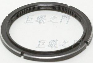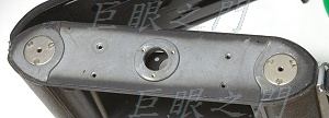 這裡有三隻螺絲,可以由機身上鎖在此螺絲孔中來固定鏡組,這個螺絲很小,只有 1.4 mm ,小了一點,本來想拆開研究看能否多鑽幾個螺絲孔,但是拆不開,看起來要拆的話要大拆,還是算了,因為裡面的結構是兩道複螺紋,拆開萬一進了金屬屑那就糟了。將就吧,用的時候小心點就是了,不要撞到。其實裡面鎖螺絲的牙也只有 1.5 mm 厚度,真的有點勉強,還好此鏡並不重,不過還是要小心,萬一有鬆動現象那就最好用膠補強甚至黏死,不過能不黏還是不要黏,黏了會增加維修的麻煩。