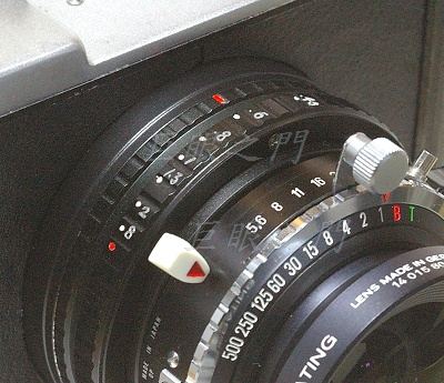 另一個角度。右方有個黑色的三角凸起撥桿,撥動時可以將光圈保持在打開狀態,因此在測試時不需要用快門線一直鎖著。