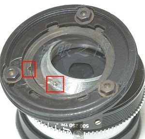裝配時的次序是這樣的,先把鏡頭鎖上,不要裝濾鏡環,這樣才能由對焦環與鏡心的縫隙中調整無限遠。調好了無限遠,記得鏡頭轉上去的位置,再把鏡頭拆掉,把濾鏡環裝上。再把鏡頭裝上,由濾鏡環上三個螺絲孔中其中一個螺絲孔中把小起子伸進去鎖住原來固定鏡頭用的小沈頭螺絲。因此裡面小螺絲的位置要與外面的螺絲孔位置配合才行。