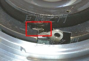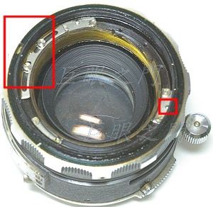 濾鏡環取下後可以看到裡面的無限遠調整裝置,左邊紅框是微調與對焦環的相對位置,其他的部份有三片金屬片,上面的小螺絲,如右方的紅框中,放鬆後可以做比較大幅度的調整,先把無限遠調整到極限再固定好。