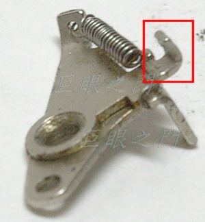 不過有個問題,因為無限遠調到極限以後,裡面的壓光圈桿最下方會有缺口,而鏡身光圈連動機構上剛好有個凸起會卡進去,本來只會沿著桿子移動,但是因為鏡心後調的關係而產生了這個問題,費了一番工夫才把這個相當於鏡尾頂針的零件拆出來,把紅框中的彎勾角度向圖中反時針方向彎大一點,這樣裝回去時就不會卡進缺口中了,但是會不會用了一段時間因為磨損之類的又會卡,我就不敢保證了。