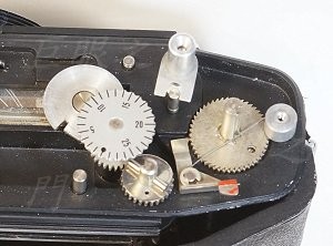 因為原來使用底片的方式與現在用的片幅不一樣,因此原來的捲片裝置不能用,要先把頂蓋拆掉改造,轉軸上有螺絲鎖住,要拆掉,靠著背帶環的位置也有螺絲,也要拆掉。拆的時候要注意,那個底片數目的轉盤機構只是套在裡面的軸上,所以可以直接向上撬一下就可以取下蓋子,否則蓋子會卡住。