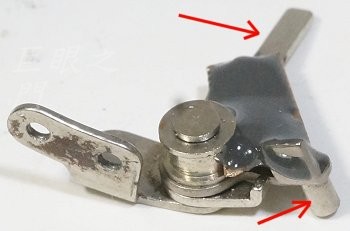 做縮光圈機構就很麻煩,廢零件堆裡面找了一個零件,應該也是壓光圈機構的零件,已經忘了是什麼鏡頭上的。只有這麼一個,所以如果還要改另一個,手上也沒有零件了。零件原來的作用方式是下方箭頭壓下時,上方箭頭會反時針頂過去,不過本來的設計兩個桿子之間有彈簧做為緩衝,現在的需求是要沒有緩衝,所以兩個桿子之間,黏了一片金屬片,用 AB 膠糊起來。
