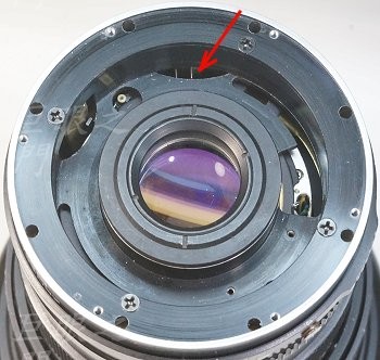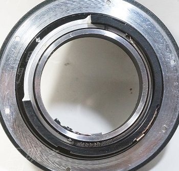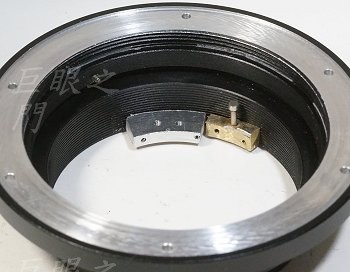在適當的位置鎖上銅片,要頂住鏡身內的縮光圈機構。鎖銅片的位置要銑掉一些,否則太凸出似乎會磨到鏡身的內壁。