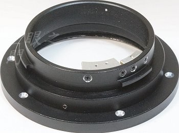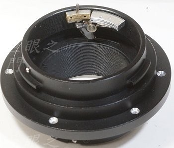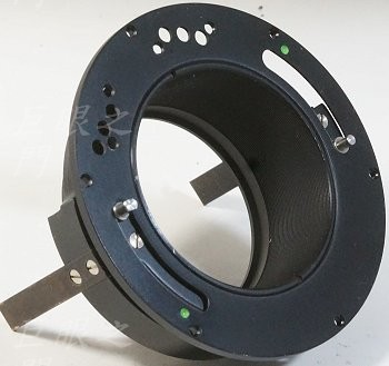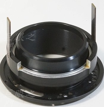 這是 P6 接環的部分,其實是兩部分結合的,上方是一個有寬凸緣的 M65 螺紋環,下方是 M65-P6 接環,把兩個部分轉緊結合就當作接環。這一面的內側稍微車凹入些,這樣剛好扣在上圖中的環上。週邊鑽螺絲孔,剛好可以鎖在原來鏡身的環上。當然這個環與原來鏡身的環要車掉的量要剛好可以對到無限遠。此鏡焦點並不是完全不會飄疑,在 70 mm 端的法蘭距稍長了一點點,也許 0.1 mm 左右,反正要依據 70 mm 端為準,否則 140 mm 端會對不到無限遠。這樣做起來其實就已經可以裝上機身拍照了,不過還要做與機身連動縮光圈的機構。