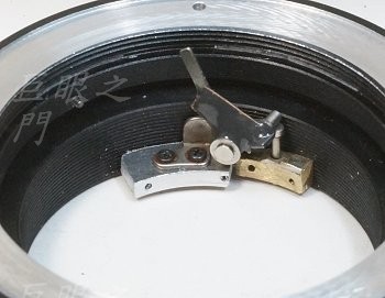鏡身內部,這個位置的零件反時針頂住就會縮光圈,不過彈力有點大,這就傷腦筋,預期會很難搞,因為要用到彈力大的彈簧才能克服原來彈簧的力量。
