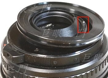 原來尾巴上面銀環有註明是 YS-T3,查網路一般 T 接環可以買到的都是 T2 接環,為何搞個 T3,大概是 Sigma 自稱 T3 接環。尾巴上的外環其實還可以轉下來,紅框中有個凸桿,類似 M42 的頂針,縮光圈用的。由後鏡組拆下的孔洞中可以看到有彈簧,想說這個彈簧如果能拉到別的方向就可以將既定值改為縮光圈。