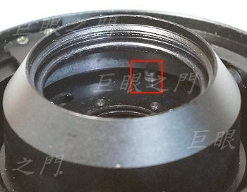 紅框中的螺絲是調整無限遠的,內圈右下角的螺絲是固定濾鏡盤的,竟然螺絲並沒有鬆,就是設計得很鬆散,那個時期的 Sigma 其實品質不算是很高,算是便宜鏡頭。